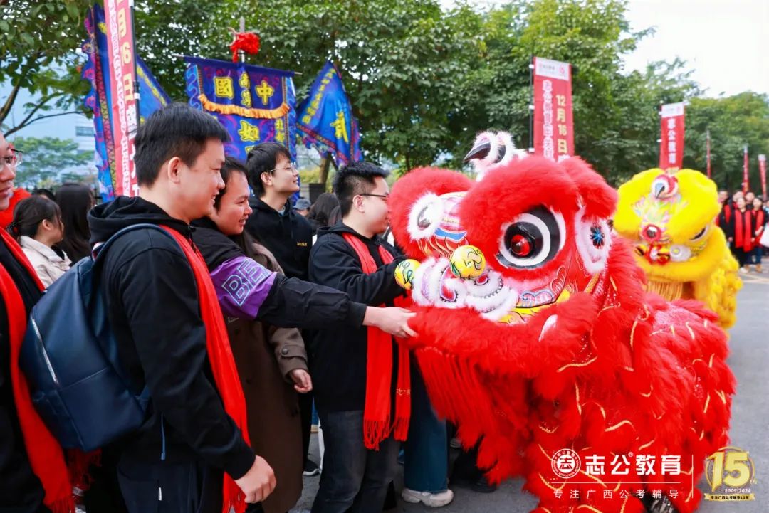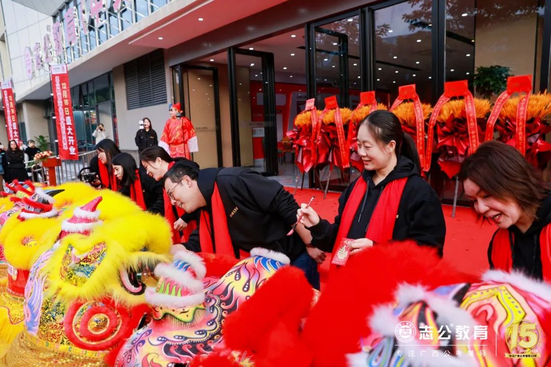 志公教育還專門請來了舞獅隊,舞獅點睛是重頭戲,董事長李勇帶領(lǐng)著公司領(lǐng)導(dǎo)們手持毛筆蘸取朱砂,對獅頭天庭進(jìn)行點睛。