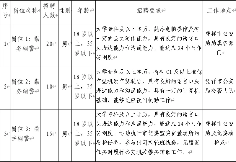 為適應(yīng)憑祥市公安機(jī)關(guān)管理工作發(fā)展需要,憑祥市公安局決定面向社會(huì)公開(kāi)招聘40名警務(wù)輔助人員(以下簡(jiǎn)稱輔警)。具體事宜如下: