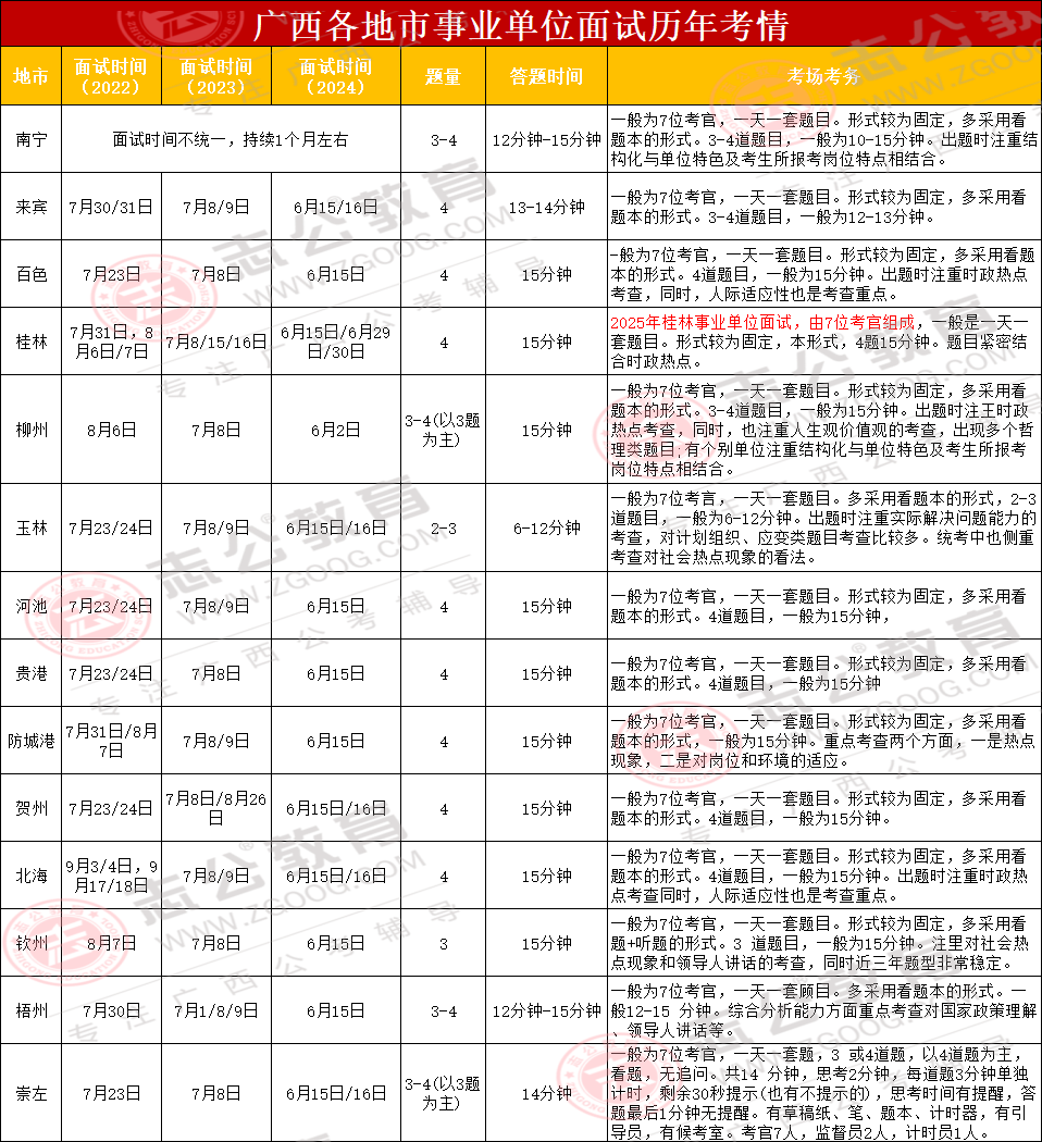當(dāng)然,我們還可以根據(jù)歷年廣西事業(yè)單位面試時(shí)間參考,推測全部地市是不是集中面試,小志給大家整理了歷年廣西各地事業(yè)單位面試時(shí)間、題量、答題時(shí)間、考場考務(wù),大家可以從下圖看出。
