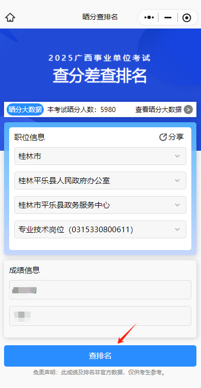 根據(jù)提示選擇自己的崗位,如實(shí)輸入分?jǐn)?shù),不僅可以看見同崗位分差情況,還可以看見自己分?jǐn)?shù)在本系統(tǒng)排名,曬分榜情況等: