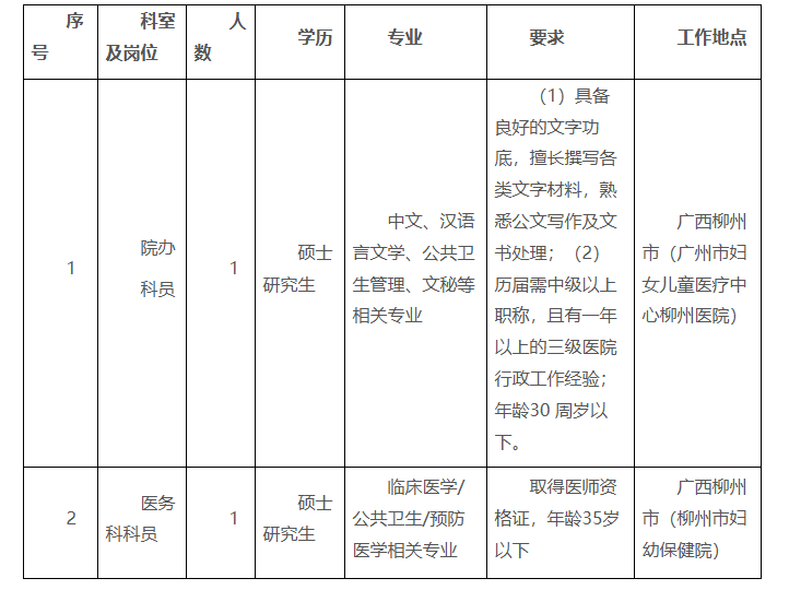 根據(jù)醫(yī)院發(fā)展需要,廣州市婦女兒童醫(yī)療中心柳州醫(yī)院、柳州市婦幼保健院現(xiàn)向社會(huì)招聘醫(yī)務(wù)科和院辦科員各一名,具體要求如下: