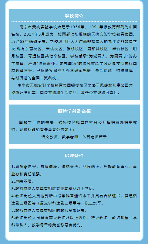 南寧市天桃實驗學(xué)校教育集團(tuán)銀杉校區(qū)2025年外聘教職工招聘公告