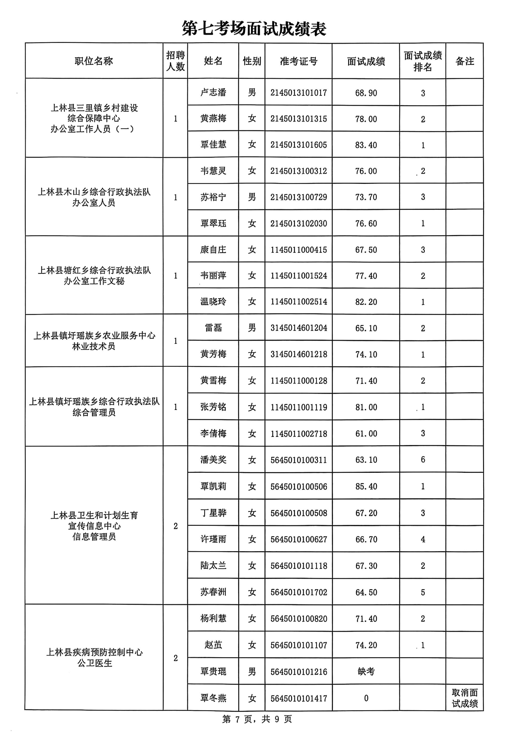 上林縣2025年公開考試招聘事業(yè)單位工作人員面試成績(jī)