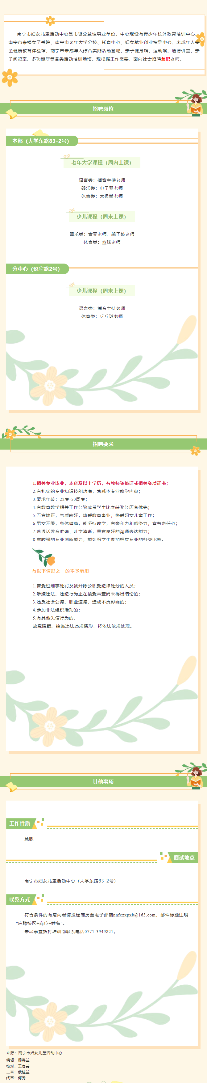 南寧市婦女兒童活動(dòng)中心招聘教師若干人