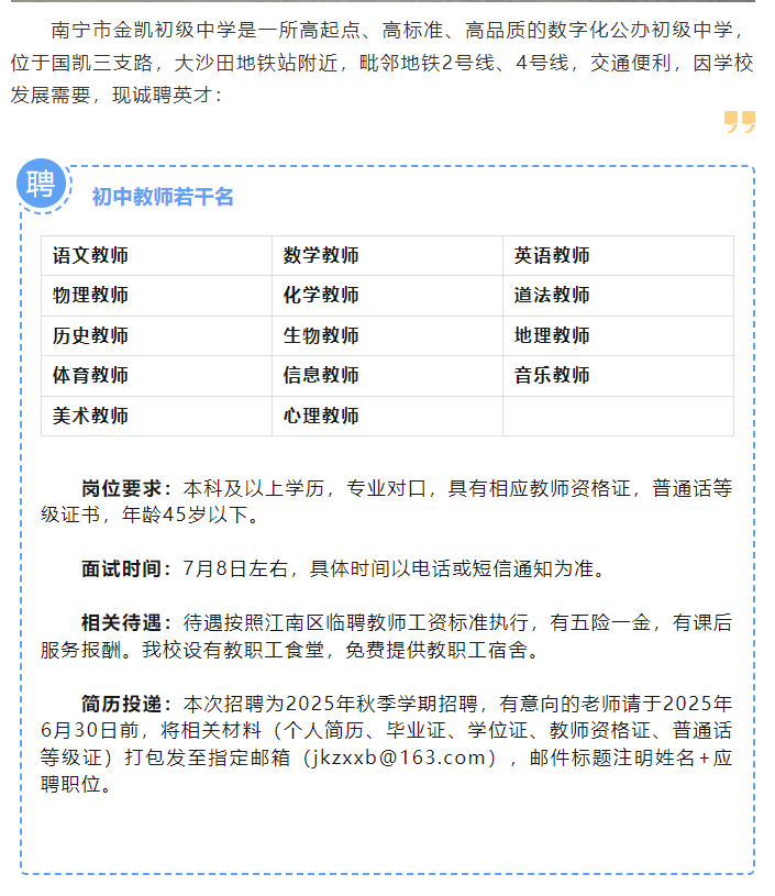 原文標(biāo)題:南寧市金凱初級(jí)中學(xué)2025年秋季學(xué)期招聘公告