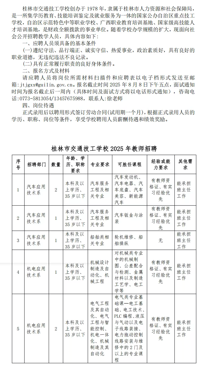 原文標題:桂林市交通技工學校2025年教師招聘公告