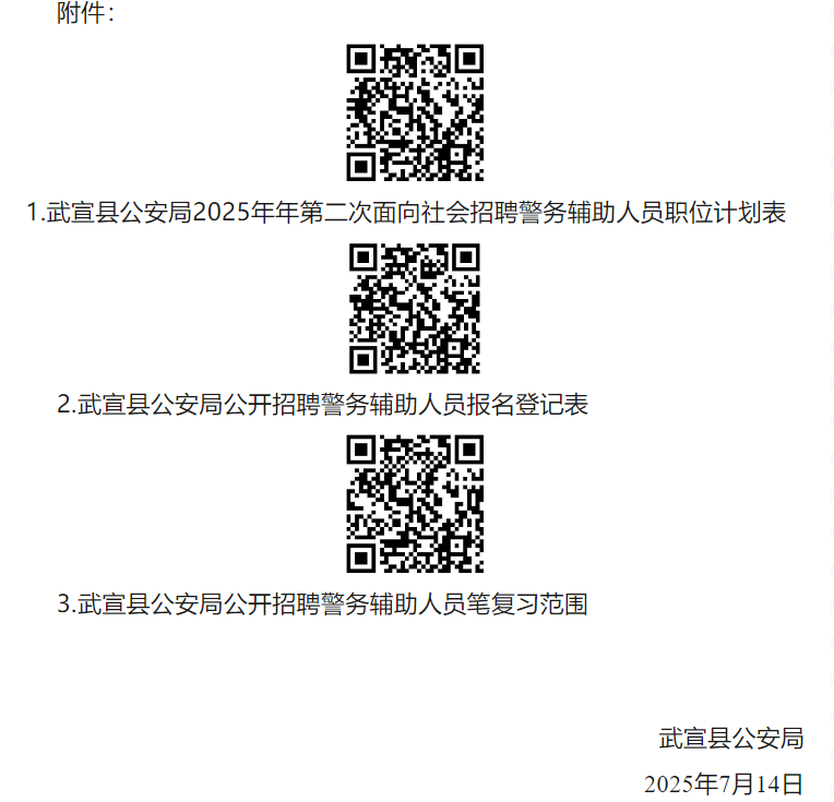 招聘人數(shù):8人,詳見《武宣縣公安局2025年第二次面向社會(huì)招聘輔警職位計(jì)劃表》(附件1)。