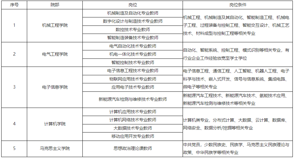 4.專任教師崗具有碩士及以上學(xué)位;具有高校教學(xué)經(jīng)驗(yàn)、中級(jí)以上專業(yè)技術(shù)職務(wù)或行業(yè)企業(yè)工作經(jīng)驗(yàn),條件可放寬至學(xué)士學(xué)位;