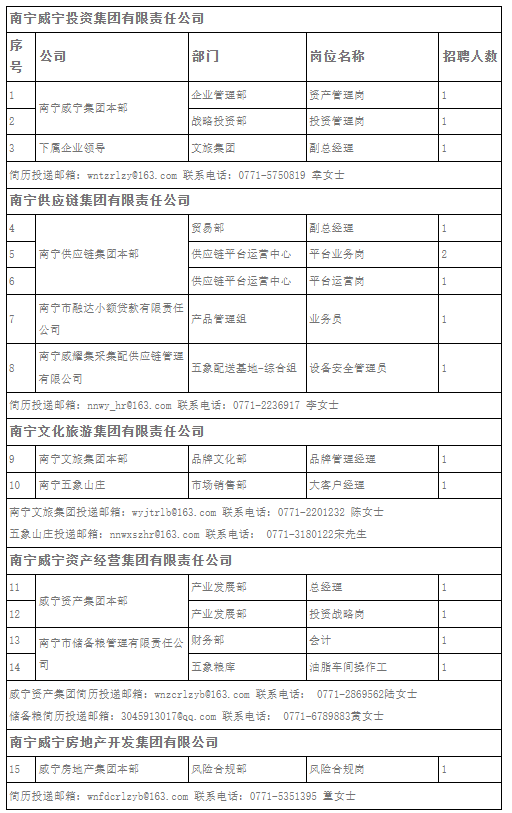 南寧威寧投資集團有限責(zé)任公司現(xiàn)因集團業(yè)務(wù)高速發(fā)展需要,集團本部及各下屬企業(yè)誠邀各類優(yōu)秀人才加盟,公司將提供完善的激勵晉升機制及廣闊的發(fā)展空間。熱忱歡迎有志之士加盟,公司將為您提供完善的激勵晉升機制及廣闊的發(fā)展平臺,招聘崗位、人數(shù)及崗位要求詳見附件。