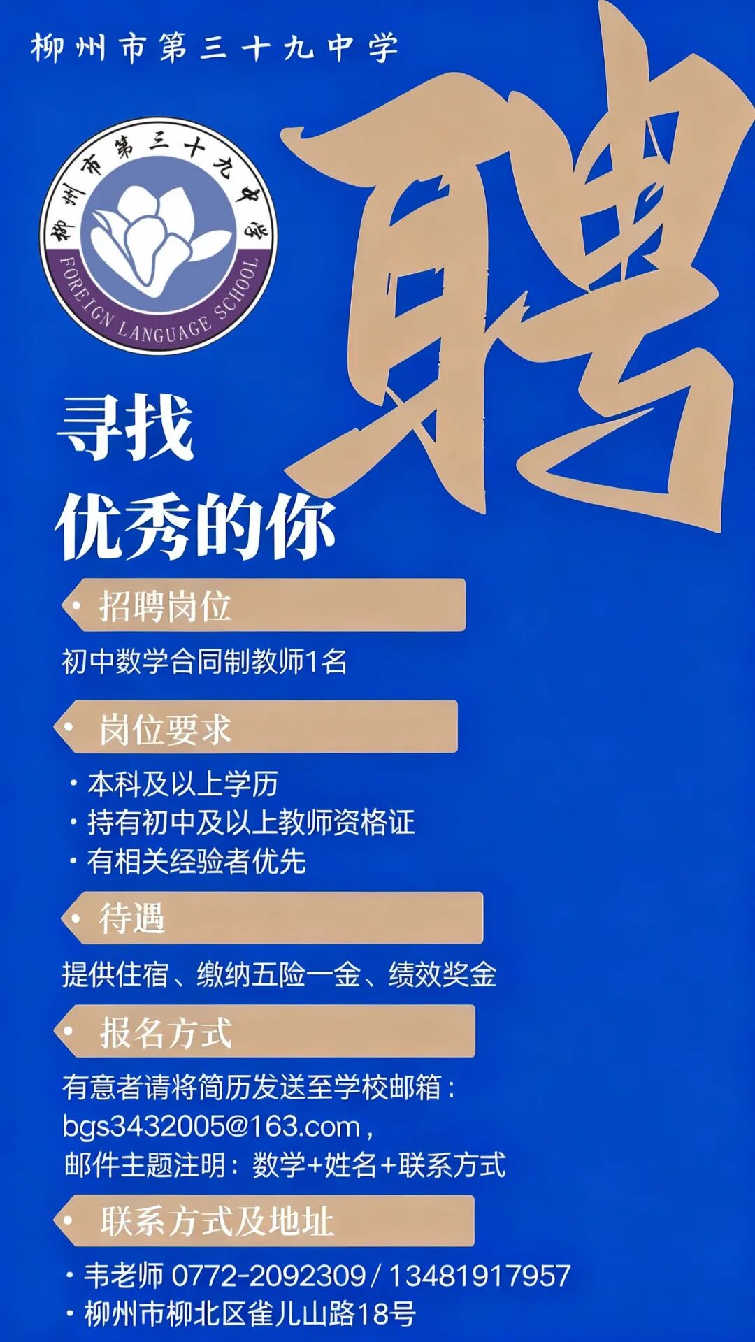 2025年柳州市第三十九中學招聘初中數學合同制教師1名