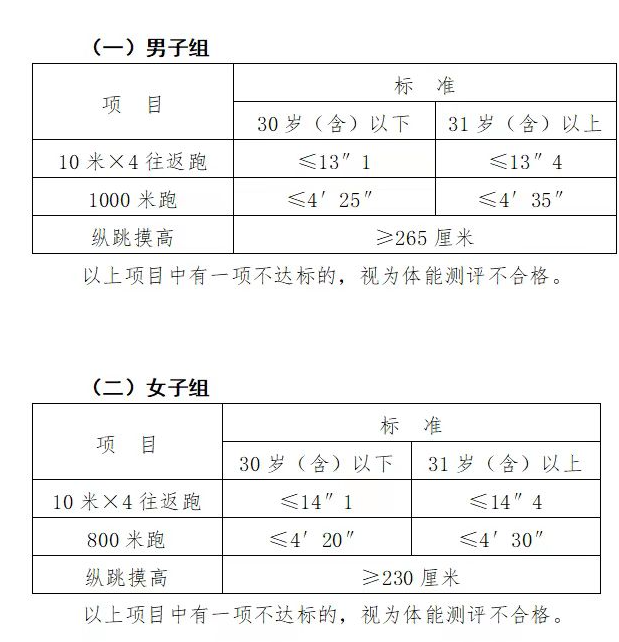 體測(cè)項(xiàng)目為縱跳摸高、10米×4往返跑和1000米(男)或800米(女)長(zhǎng)跑,體能測(cè)試項(xiàng)目評(píng)分標(biāo)準(zhǔn)依據(jù)《公安機(jī)關(guān)錄用人民警察體能測(cè)評(píng)項(xiàng)目和標(biāo)準(zhǔn)(暫行)》執(zhí)行(見(jiàn)附件3),體能測(cè)試項(xiàng)目規(guī)則按照《公安機(jī)關(guān)錄用人民警察體能測(cè)評(píng)實(shí)施規(guī)則》執(zhí)行(見(jiàn)附件4)。