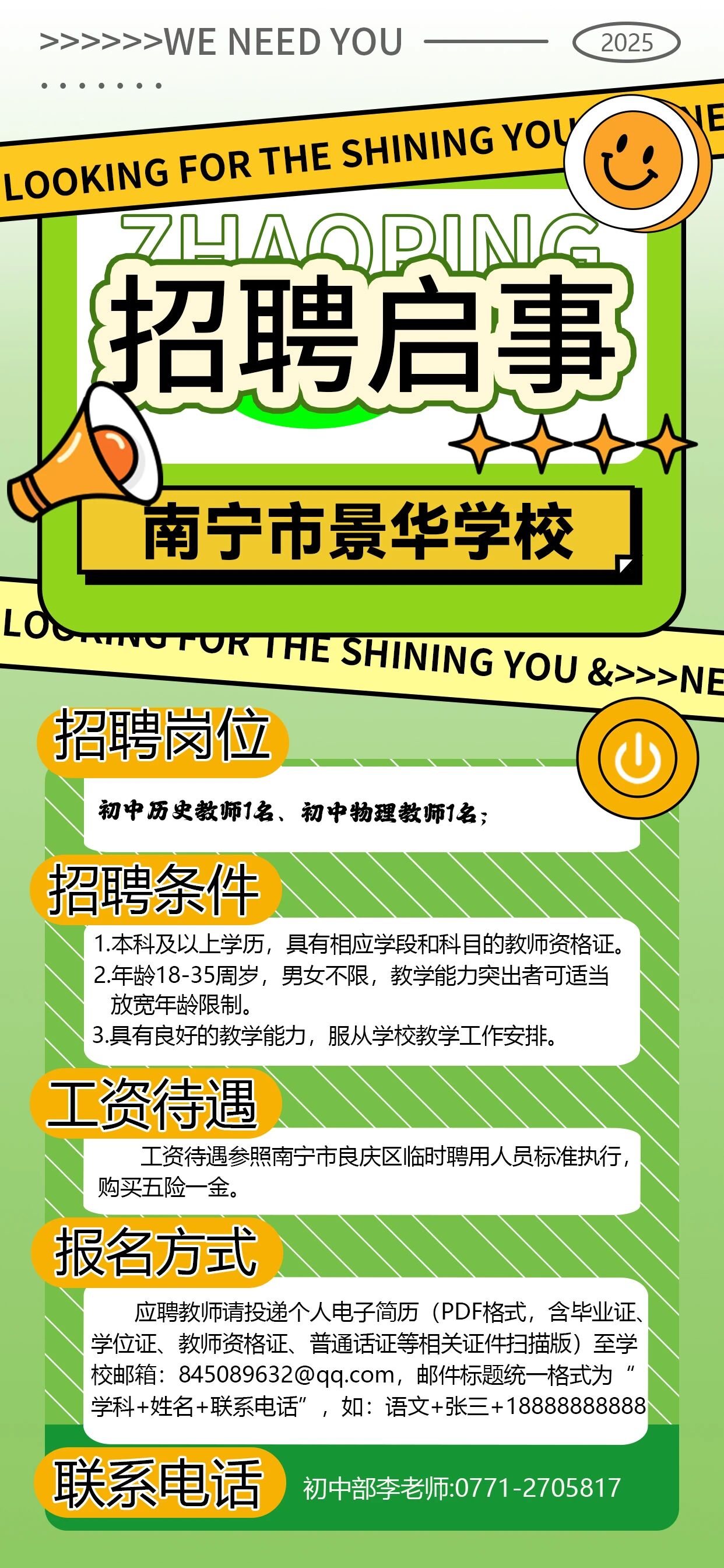 2025年南寧市景華學校急聘初中歷史教師1名、初中物理教師1名