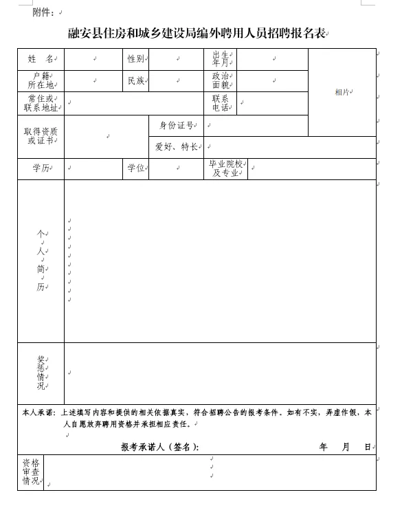 (1)報(bào)名方式:應(yīng)聘者將報(bào)名表等相關(guān)材料發(fā)送至融安縣住建局郵箱:raxjsj@163.com,報(bào)名材料主要包括:報(bào)名表(請自行下載填寫,并手寫簽名)、身份證、學(xué)歷學(xué)位證書、資格證書、獲獎(jiǎng)證書等。以上材料均需掃描成PDF版本。
