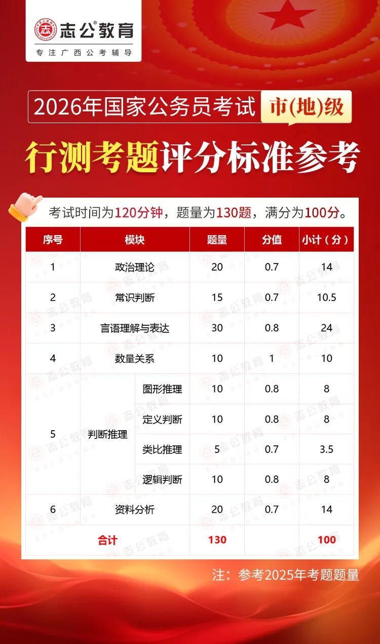 無論報名人數是否會增加,提升自身實力才是應對2026年國考的關鍵。行測作為國考公共科目筆試的核心模塊,不僅分值占比高(通常為 100 分),更是考生之間拉開分差的關鍵戰(zhàn)場。它并非單純考查知識儲備,而是通過言語理解、判斷推理、數量關系、資料分析、常識判斷、政治理論六大板塊,綜合評估考生的信息處理速度、邏輯思維能力、應急決策水平等綜合素質。
