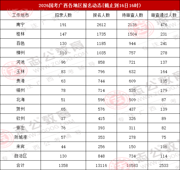截止到16日16時(shí),2026國(guó)考廣西地區(qū)各地市報(bào)名人數(shù)最多的地市為南寧、桂林、百色,其中南寧報(bào)名人數(shù)為2612人,位居第一!整體報(bào)考人數(shù)達(dá)13116人!對(duì)此,小志建議大家,報(bào)考崗位時(shí)需將自身職業(yè)愿景與個(gè)人實(shí)際條件(如專業(yè)、學(xué)歷、基層經(jīng)驗(yàn)等)緊密結(jié)合,理性分析崗位競(jìng)爭(zhēng)情況,最終做出最適合自己的選擇。
