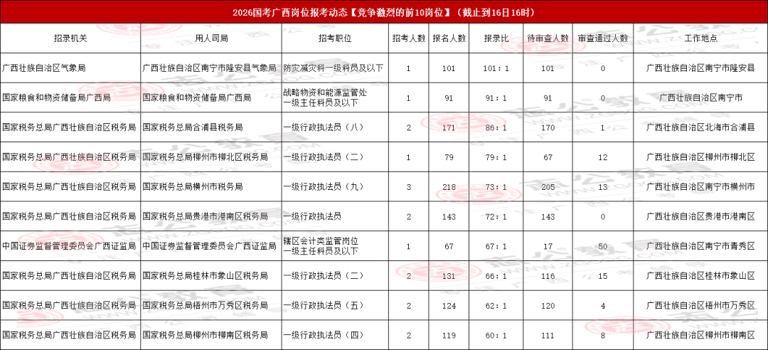 我們接著來(lái)看廣西地區(qū)國(guó)考報(bào)名競(jìng)爭(zhēng)最激烈的前十職位匯總情況。當(dāng)前,國(guó)家稅務(wù)總局廣西壯族自治區(qū)稅務(wù)局-國(guó)家稅務(wù)總局桂林市臨桂區(qū)稅務(wù)局的【一級(jí)行政執(zhí)法員(三)】 職位,以220人的報(bào)名數(shù)成為目前前十職位中最熱門的選擇。