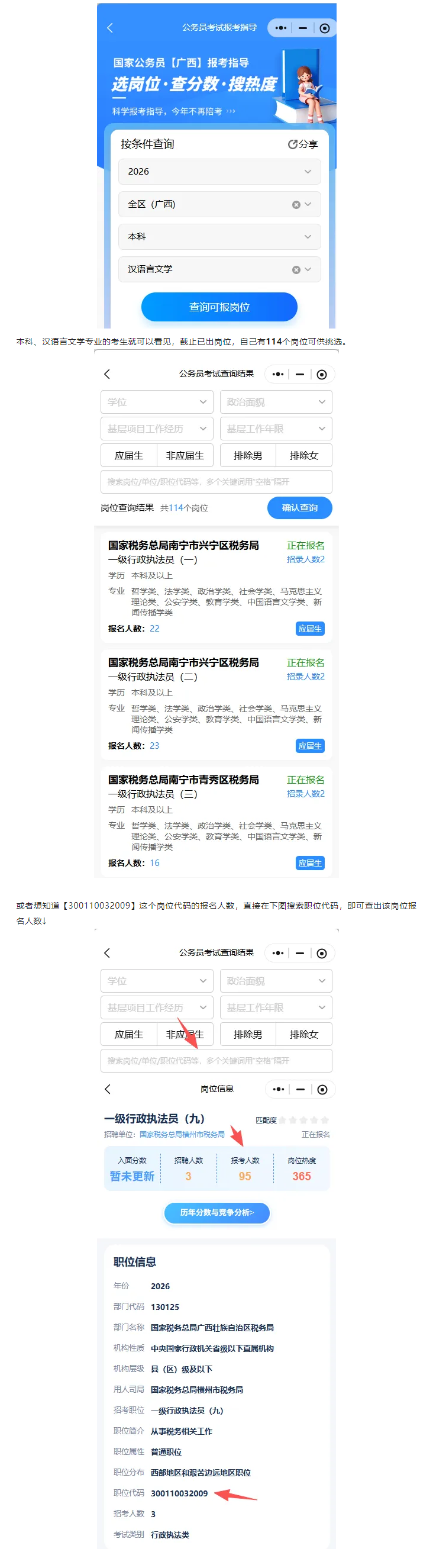 因?yàn)槭翘幱趪?guó)考選崗階段,我們更想知道選崗功能,思路是【選擇學(xué)歷】-【選擇專業(yè)】/輸入崗位代碼即可看見(jiàn)想查看的崗位,自己查看可以報(bào)名的大致崗位范圍及具體崗位的報(bào)名人數(shù),下面以2026年國(guó)考(廣西)崗位為例,比如,你是本科、漢語(yǔ)言文學(xué)專業(yè)的考生,選擇學(xué)歷-【本科】輸入【漢語(yǔ)言文學(xué)】選擇彈出來(lái)的分類目錄。