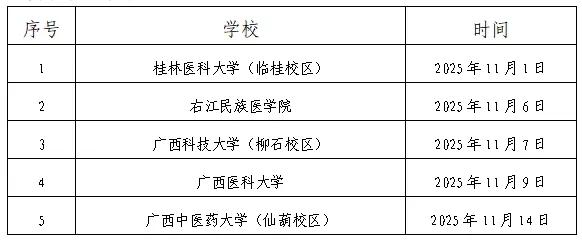 采取現(xiàn)場報名方式的人員請前往桂林醫(yī)科大學(xué)、右江民族醫(yī)學(xué)院、廣西科技大學(xué)、廣西醫(yī)科大學(xué)、廣西中醫(yī)藥大學(xué)等區(qū)內(nèi)各院校雙選會現(xiàn)場進行應(yīng)聘。廣西區(qū)內(nèi)各院校雙選會舉辦時間詳見下表。
