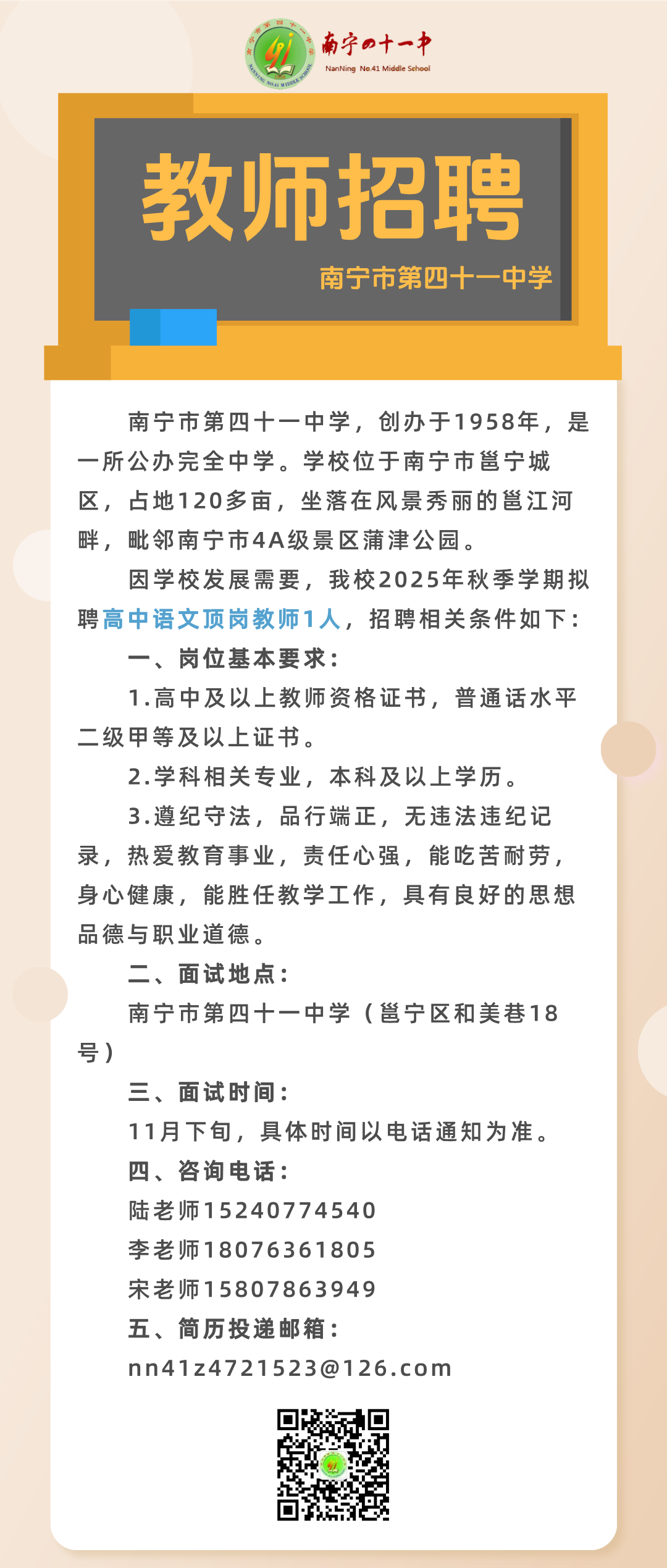 2025年秋季學(xué)期南寧市第四十一中學(xué)關(guān)于公開招聘頂崗教師的啟事