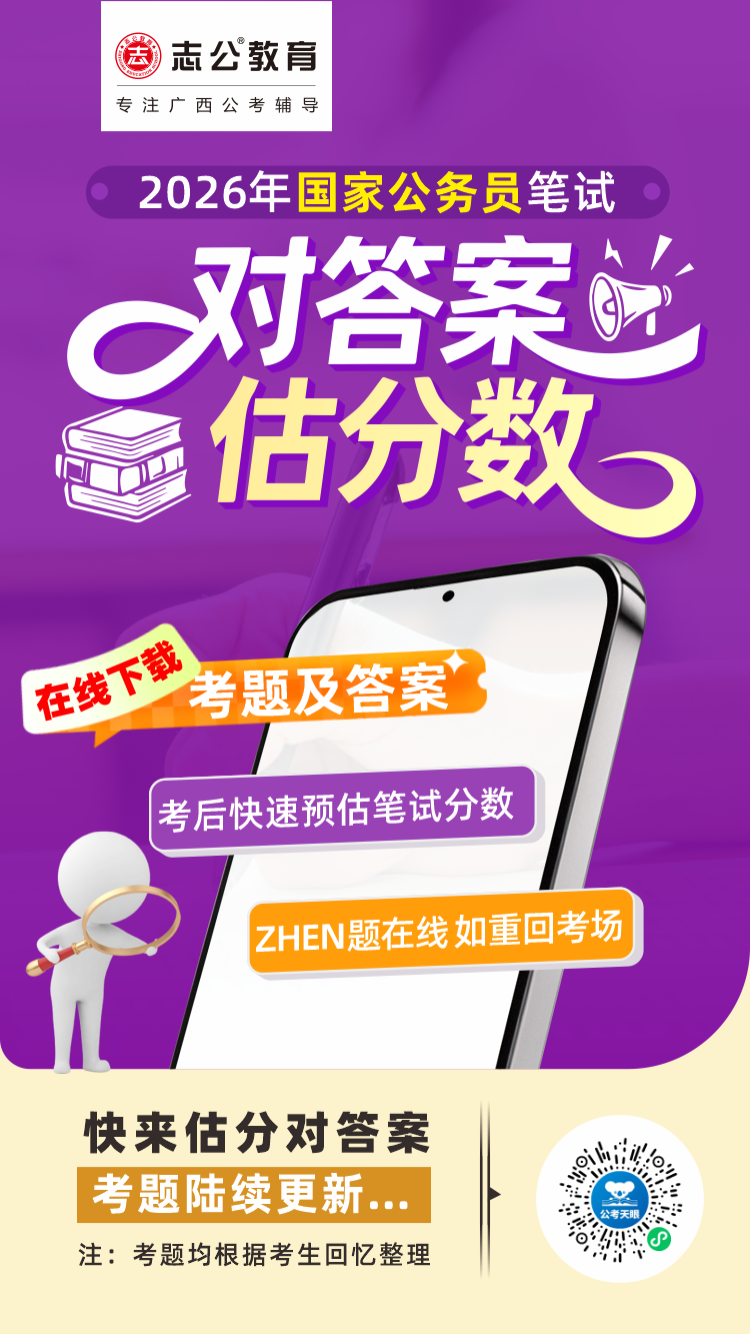 剛走下考場?志公教育為廣西考生整理了2026國考筆試考及答案在線下載服務(wù),推出在線估分平臺,助你快速預(yù)估分?jǐn)?shù)。