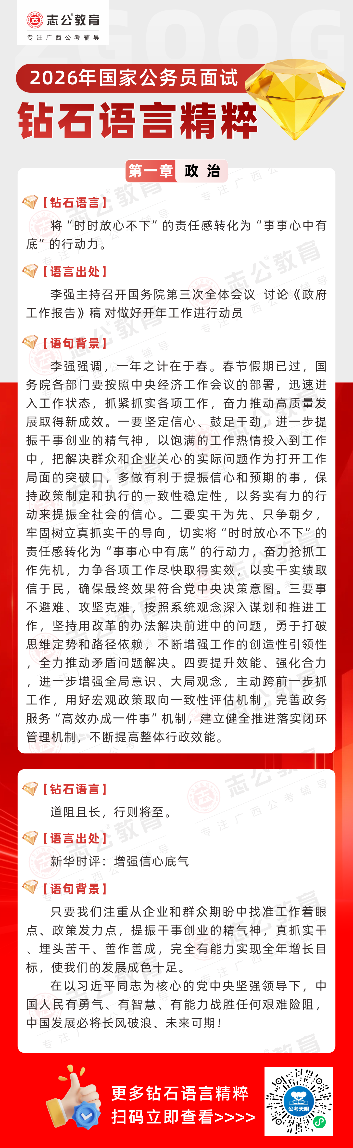 志公教育推出《2026國家公務(wù)員面試·鉆石語言精粹》政治篇!幫助考生把握政治類題目應(yīng)答邏輯,提升語言表達層次,助你在面試中脫穎而出。備考2026國考面試,從掌握“鉆石語言”開始!