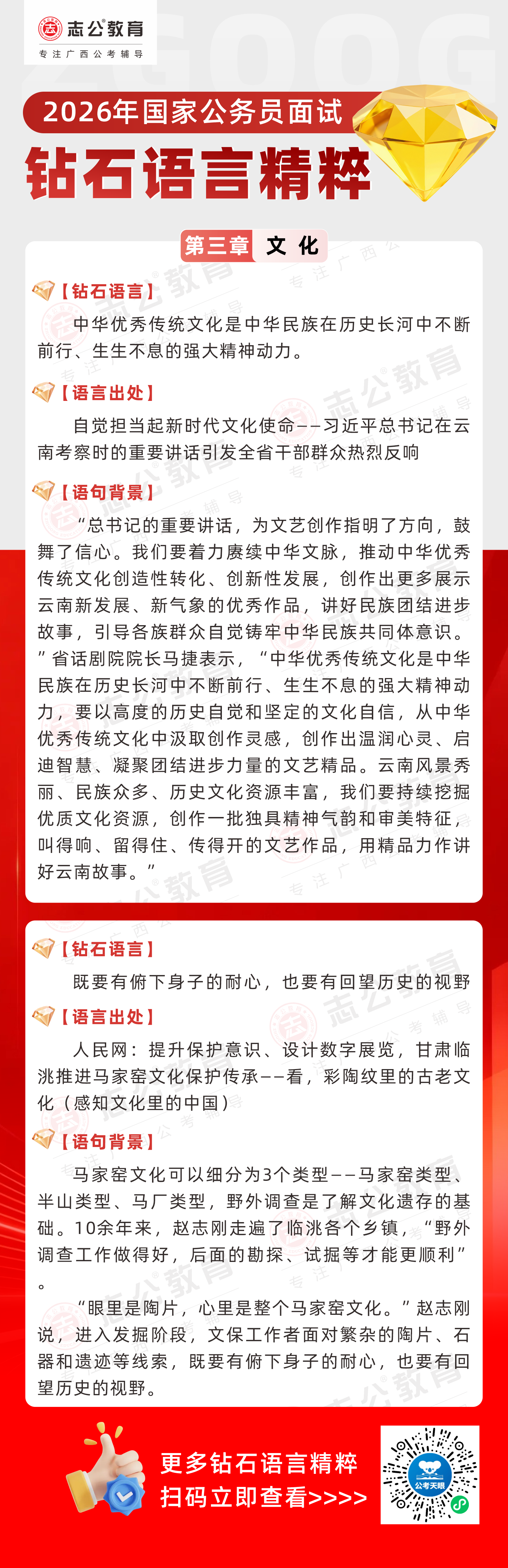 志公教育推出《2026國家公務(wù)員面試·鉆石語言精粹》!幫助考生把握文化類題目應(yīng)答邏輯,提升語言表達(dá)層次,助你在面試中脫穎而出。備考2026國考面試,從掌握“鉆石語言”開始!