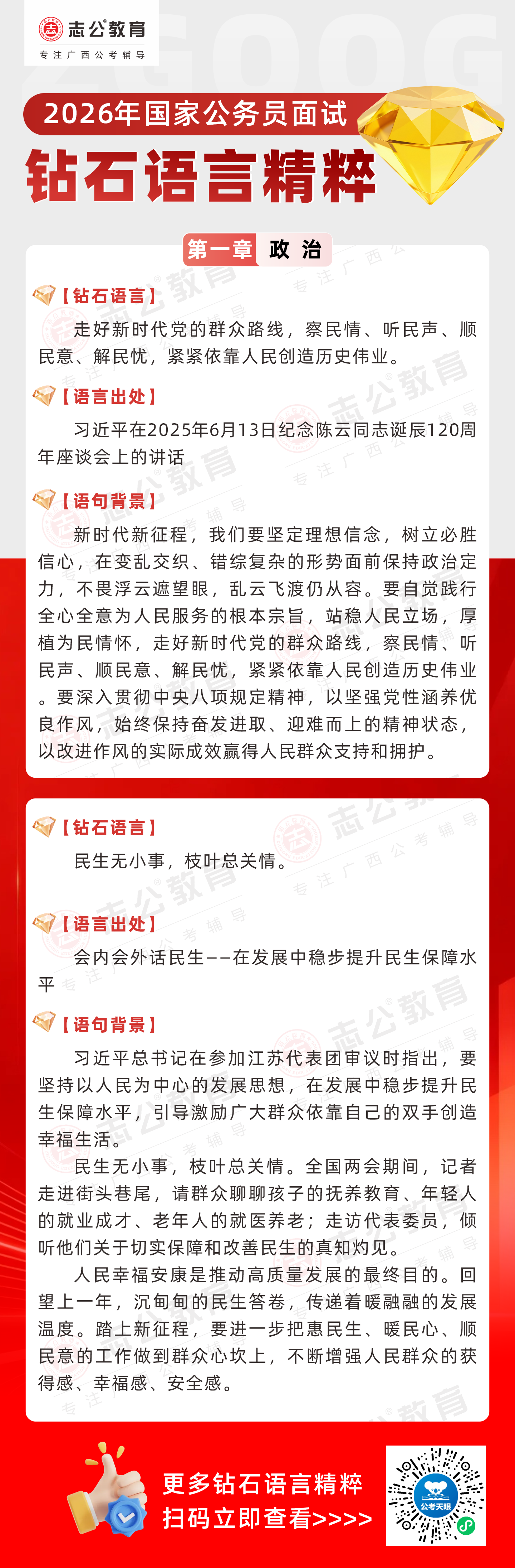 志公教育推出《2026國家公務(wù)員面試·鉆石語言精粹》政治篇!幫助考生把握政治類題目應(yīng)答邏輯,提升語言表達(dá)層次,助你在面試中脫穎而出。備考2026國考面試,從掌握“鉆石語言”開始!