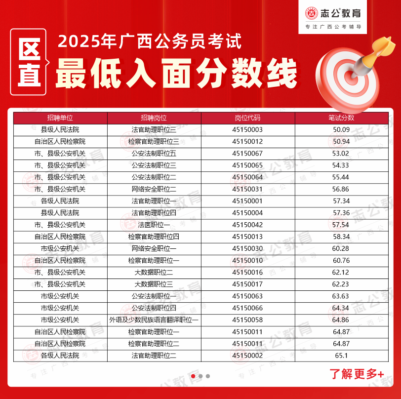 溫馨提示: 以上數(shù)據(jù)均整理自官方發(fā)布的面試資格審查公告,僅供考生參考。2025年廣西公務(wù)員考試面試入圍名單及具體分?jǐn)?shù)線以廣西人事考試網(wǎng)及各招錄單位官方通知為準(zhǔn)。如需查詢更多2025廣西區(qū)考進面分?jǐn)?shù)、不同系統(tǒng)的區(qū)直單位分?jǐn)?shù)線,或獲取完整的廣西公務(wù)員面試名單,歡迎持續(xù)關(guān)注志公教育的后續(xù)更新。我們將及時為您整理官方信息,助您全面了解考情,科學(xué)備考。