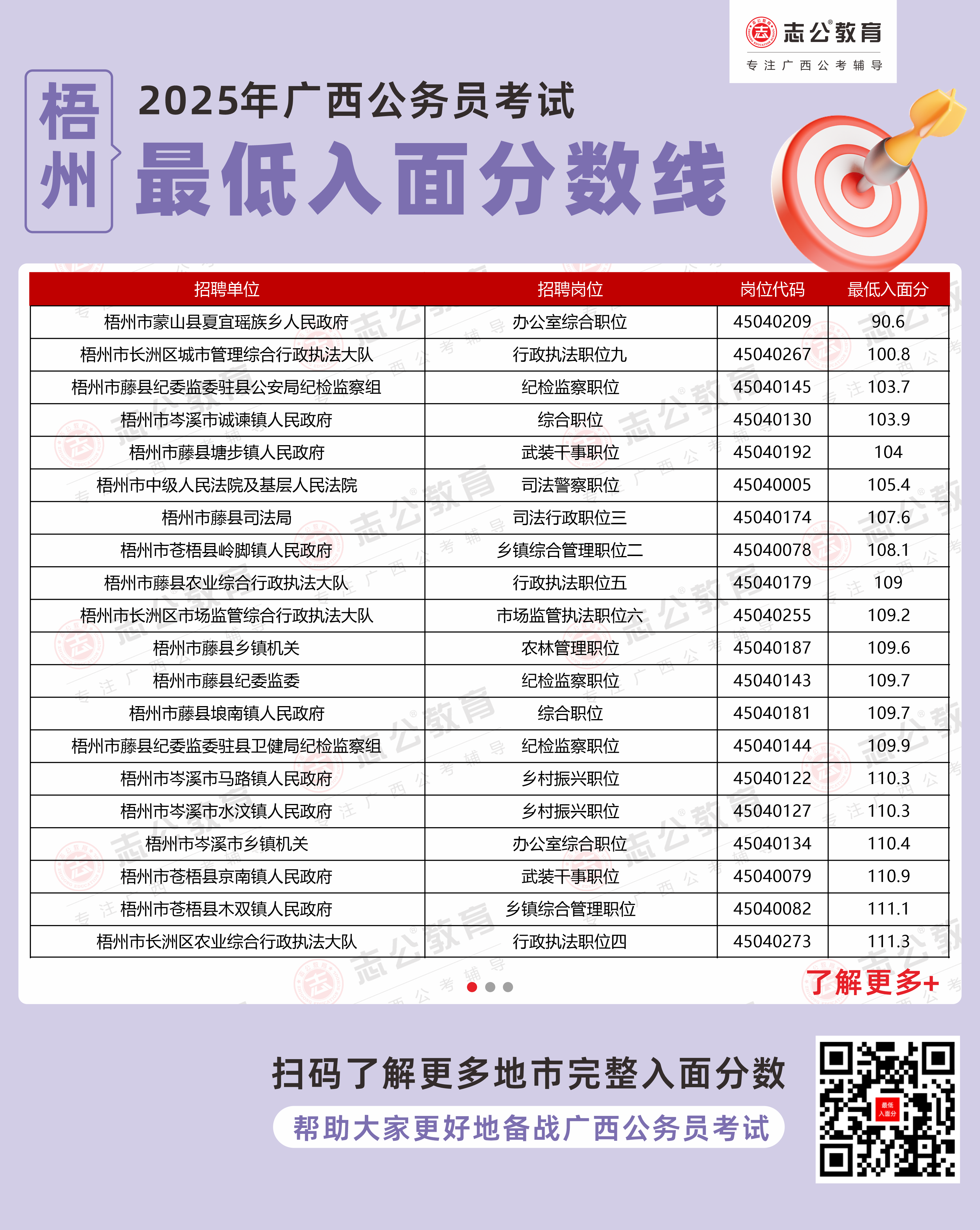 以下為志公教育根據(jù)官方發(fā)布的面試資格審查公告及公開數(shù)據(jù)整理的梧州市部分單位的進面最低筆試分數(shù)(含照顧加分),數(shù)據(jù)僅供參考,具體以官方實際公布為準。