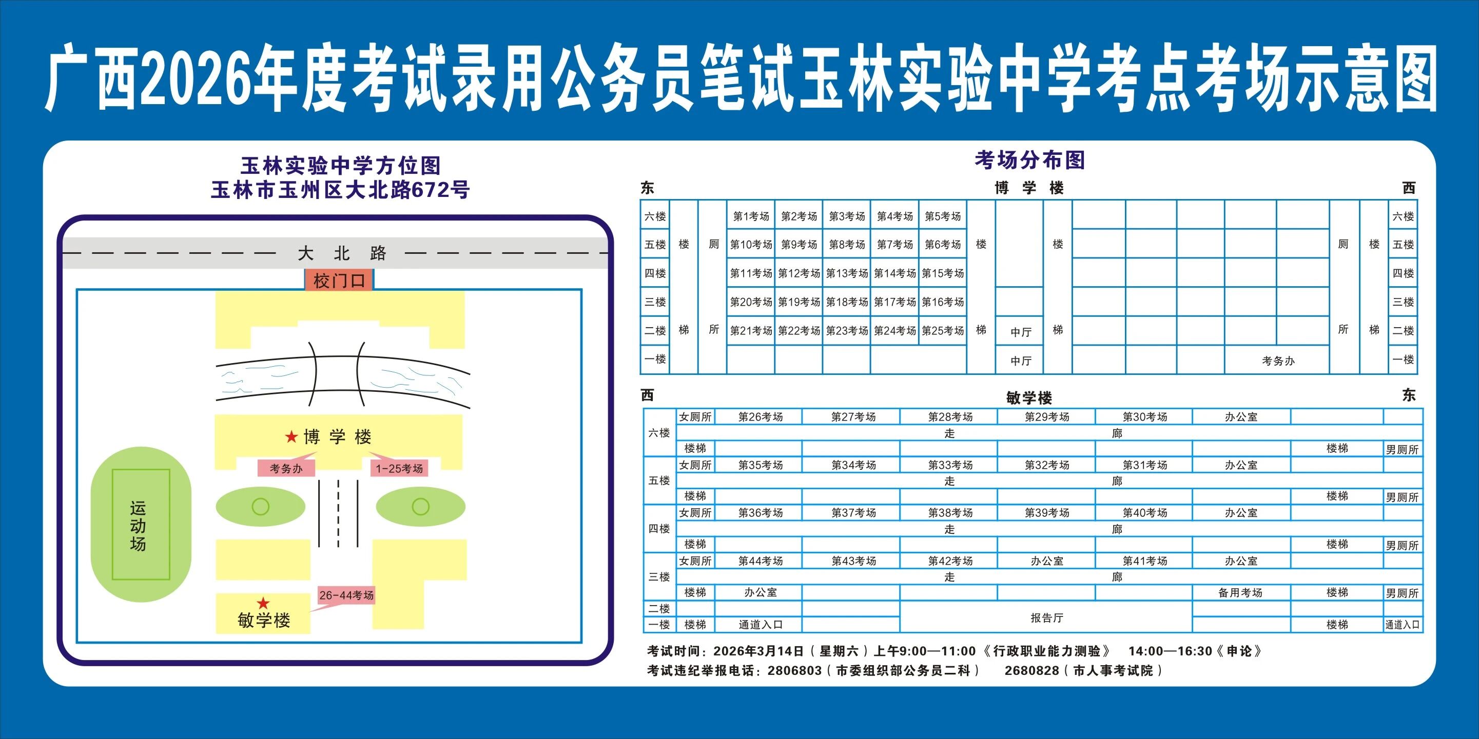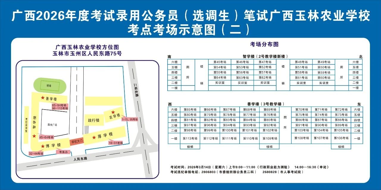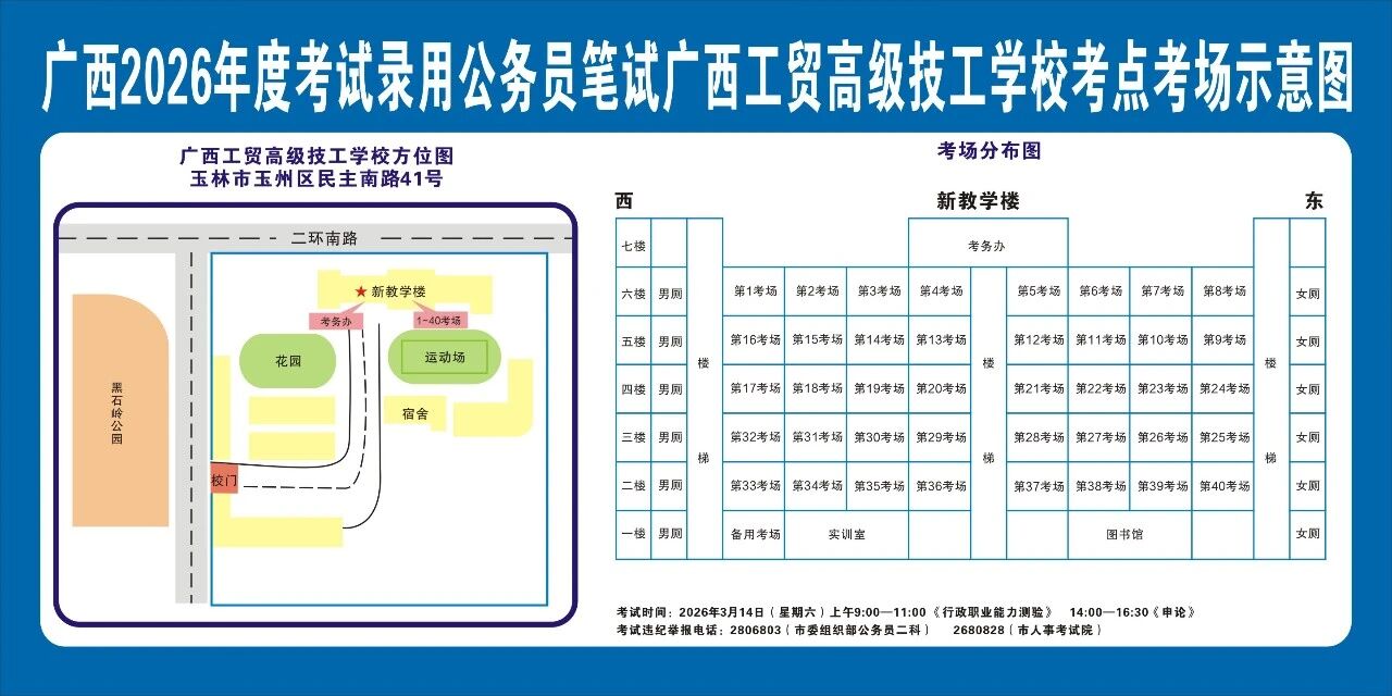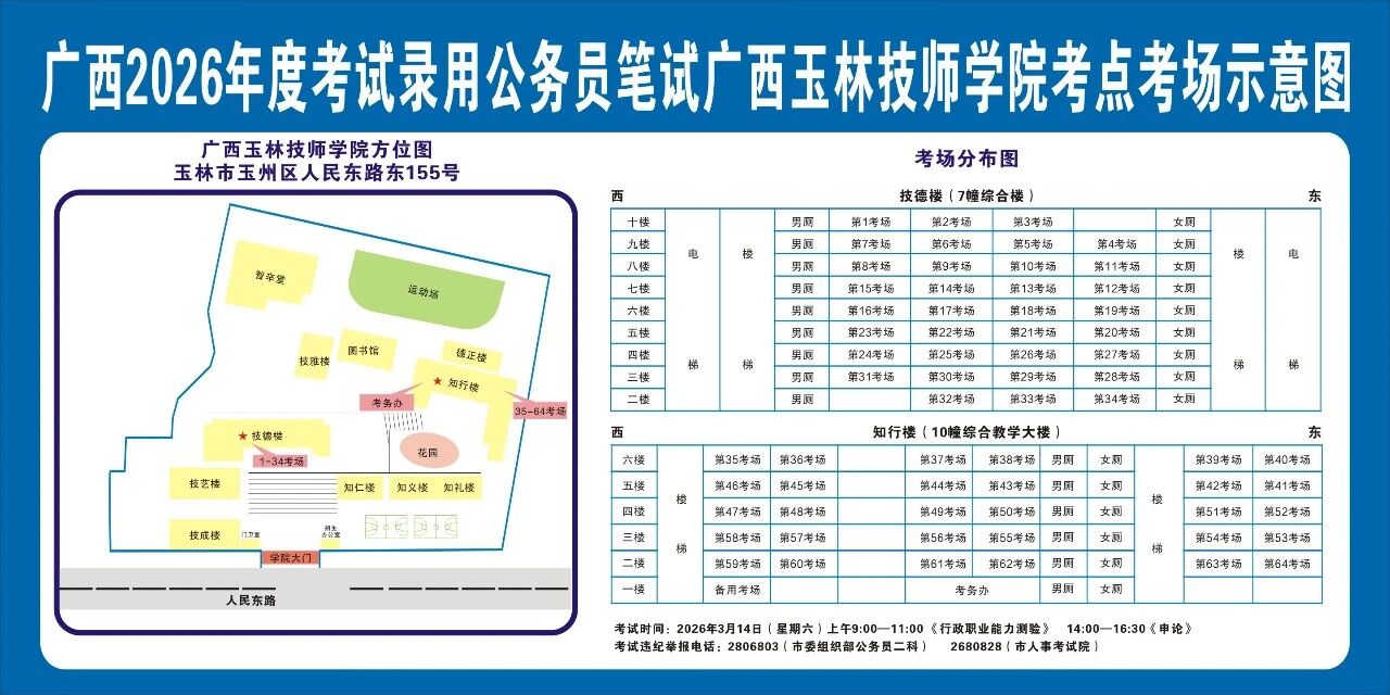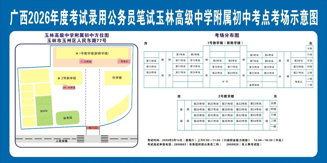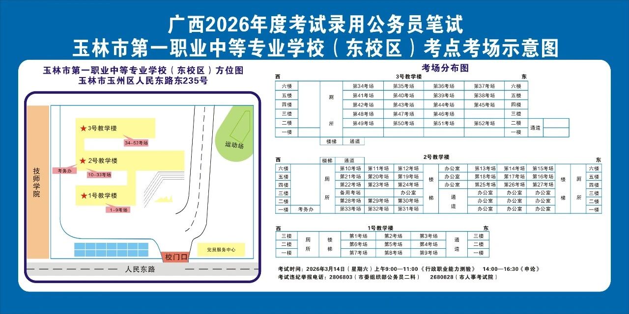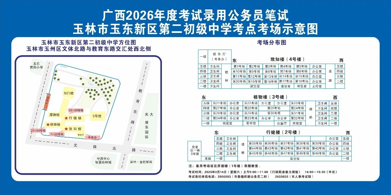 除考試當(dāng)天考生可以進入考點外,考生不得提前進入考點查看考場(學(xué)校將在大門處擺放考場分布示意圖),玉林考區(qū)10個考點的考場布置情況如下: